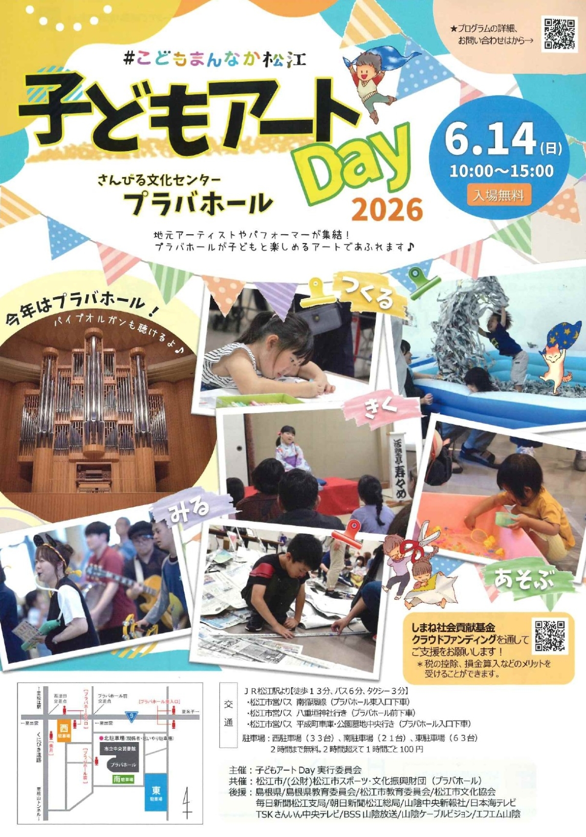 イベント情報 ホーム イベント情報 子どもアートDay 2026 共催 子どもアートDay 2026 #こどもまんなか松江 地元アーティストやパフォーマーが集結! プラバホールが子どもと楽しめるアートであふれます♪ 日程 2026.06.1410:00~15:00 会場 大ホール 他 入場料 無 料 お問い合わせ プログラムの詳細、お問い合わせはこちら その他 主催:子どもアートDay 実行委員会 共催:松江市/(公財)松江市スポーツ・文化振興財団(プラバホール) イベント情報一覧