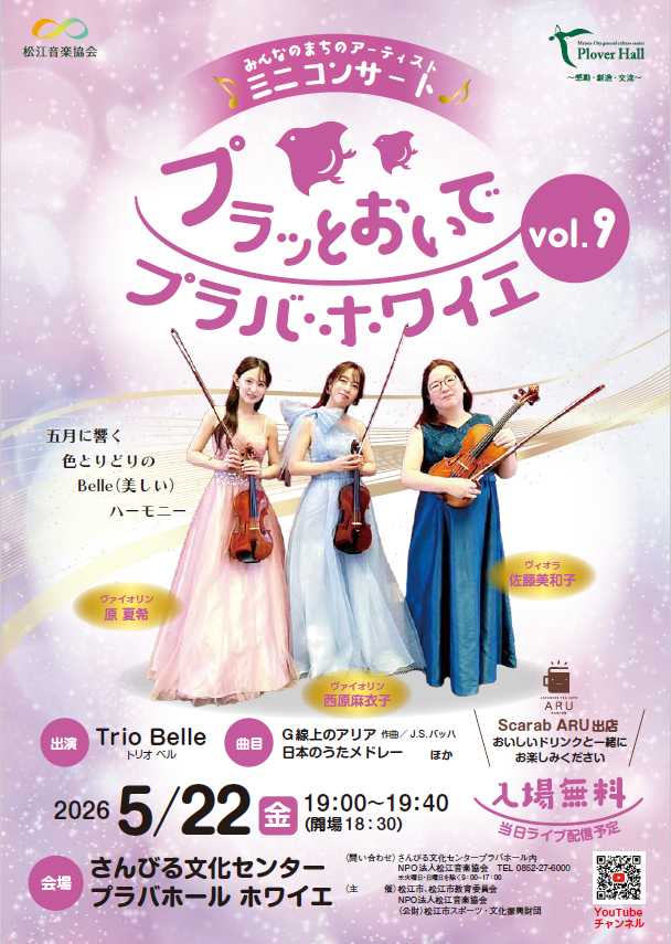 【出演】Trio Belle トリオ ベル / 原 夏希(ヴァイオリン) 西原 麻衣子(ヴァイオリン) 佐藤 美和子(ヴィオラ)